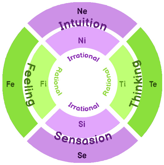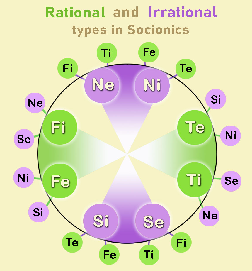 The biggest discrepancy between socionics and MBTI concerns the Jung's parameter Rationality/Irrationality. In his work "Psychological Types", Carl Jung divided all eight types (or eight function) into two groups: RATIONAL and IRRATIONAL. The four Jung's types (Se, Si, Ne, Ni) share common parameter IRRATIONALITY, and the other four types (Fe, Fi, Te, Ti) have a common parameter RATIONALITY. According to Jung, a type is rational if its main (dominant) psychic function is rational, a type is irrational if its main psychic function is irrational.