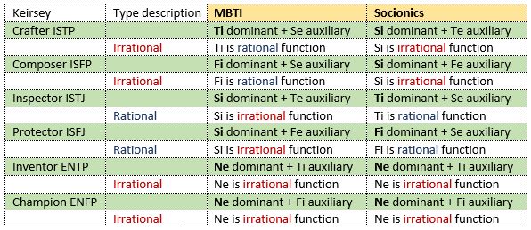 Due to the different use of the parameter rationality/irrationality, the Crafter ISTP type, socionics refers to Jungian Sensing Introverted, and MBTI refers Crafter to Jungian Thinking Introverted.