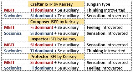 Practitioners of socionics believe that among the 16 types described by David Keirsey, the Si-dominant types are Crafter (ISTP) and Composer (ISFP). The Crafter has the dominant function Si and the auxiliary function Te, the Composer has the dominant function Si and the auxiliary function Fe. Since, for the Si-dominant type, Ne-dominant type will be most compatible, the most compatible for the Crafter is the Ne+Fi type (ENFP), and for the Composer the most compatible is the Ne+Ti type (ENTP).