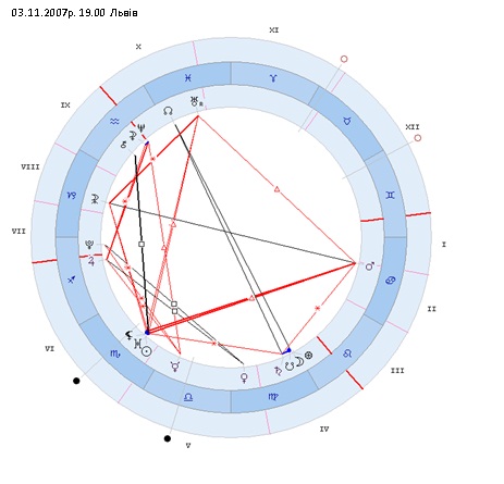 5) Доми. В даному прикладі застосовуємо інтерпретацію за нерівнодомною системою (від Висхідного знаку). Найбільше планет розташовано в кутових домах (четвертому, сьомому і десятому).