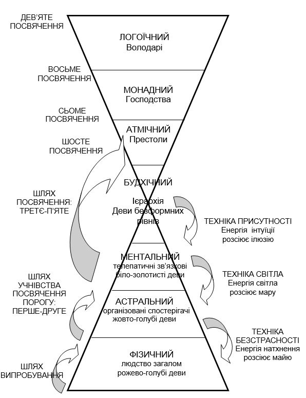 Носієм живої свідомості планетного Логоса є завжди і незмінно велика Ієрархія Буття, той ланцюг життя, найменша ланка якого має своє значення і в якого завдяки електричному взаємообміну духовною енергією найбільша ланка пов’язана з найменшою. У певному і дуже важливому значенні в житті немає нічого, крім Ієрархії, зв’язуючої сонце з сонцем, зірку зі зіркою, сонячну систему з сонячною системою, планету з планетою і всі планетні життя – один з одним. Головною ключовою нотою кожного окремо взятого планетного Посвячення аж до найвищого є відносини. Ми не знаємо, які ще якості можуть відкриватися Посвяченому на інших шляхах, але кінцевою метою всякого спрямування на нашій планеті є встановлення правильних відносин між людиною і людиною і між людиною і Богом, між всіма виразами божественного життя, від найкрихітнішого атома і до безмежності.