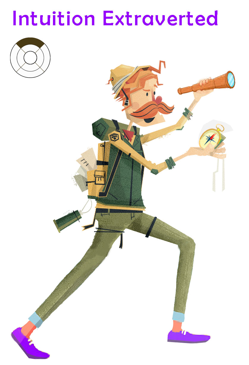 ототожнюється з «образом себе» як оптиміста, до якого прихильний світ і якому весь час повинно везти, тим сильніше почуття неповноцінності він відчуває при будь-якому натяку на свою невезучість, занудність і песимізм. При середньому ступені психологічної зрілості тип з екстравертною інтуїцією намагається довести собі та навколишнім, що він оптиміст, завжди цікавий, йому завжди везе і він задоволений життям. Йому починає здаватися, що його люблять саме за його оптимізм та бачення нових ідей. І щоб його любили, йому треба весь час підтверджувати це. Щоб уникнути нудьги, він постійно зайнятий пошуком нових вражень, людей та ідей, і постійним переключенням з одного об’єкту на інший. Він як дитина, швидко втрачає інтерес до об’єкту, щойно об’єкт перестає бути новим. Така поверхнева взаємодія з об’єктами призводить до болісного відчуття внутрішньої порожнечі, від якого такий тип намагається втекти у ще активніший пошук задоволення від нових об’єктів. При ще меншій психологічній зрілості і небажанні відчувати смуток чи психологічний дискомфорт, в такого типу зростає потреба погоні за новими враженнями, що може доходити аж до бродяжництва.