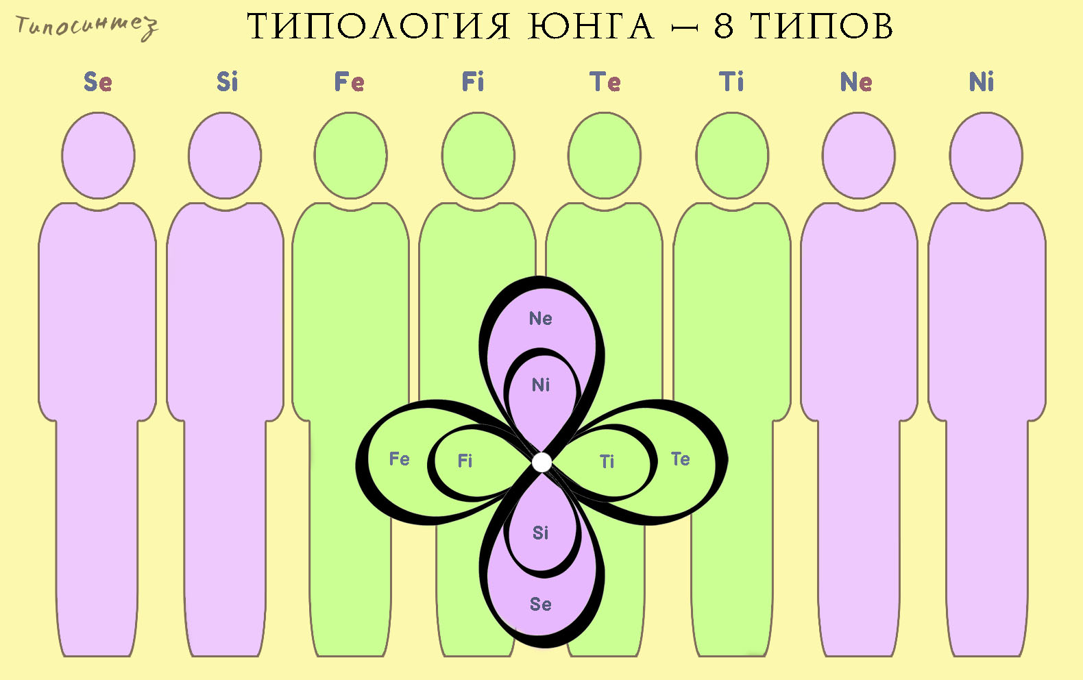 Тип человека определяется главной психической функцией. Если главной функцией является Сенсорика Экстравертная, то и тип называется Сенсорный Экстраверт (Se), если главной функцией является Чувство Интровертное, то тип называется Чувственный Интроверт (Fi) и т.д.
