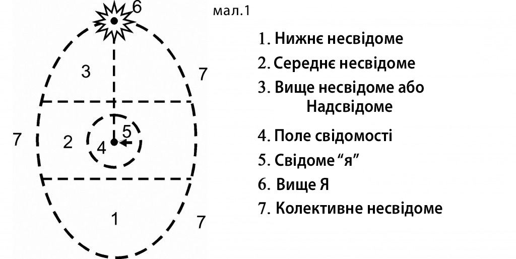 Перша карта-схема, яку Асаджіолі назвав "яйцем" (мал. 1), представляє нашу психіку в цілому. Три горизонтальні частини овалу означають наше минуле, теперішнє і майбутнє. Нижче несвідоме (1) представляє головним чином минуле нашої психіки, присутнє в ній у формі пригнічених комплексів і давно забутих спогадів. Якщо ми хочемо свідомо сприяти своєму зростанню, нам потрібно досліджувати своє нижче несвідоме. А то воно може стати джерелом проблем, сховищем пригніченою енергії, яка контролює наші вчинки та позбавляє нас свободи.