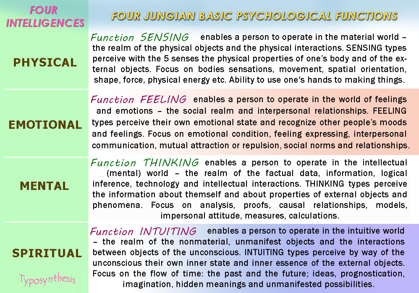 We could relate the psychological function SENSING with Gardner’s Bodily-kinesthetic intelligence. Sensing also includes Gardner’s Naturalistic intelligence and Sensing Introverted is linked to Gardner’s Spatial Intelligence.