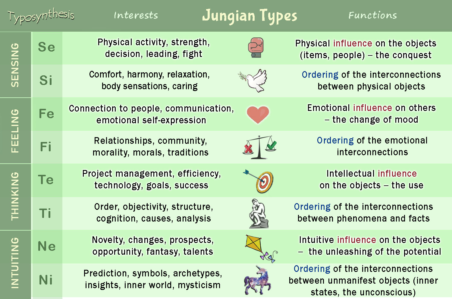 ✅ Function FEELING enables a person to operate in the world of feelings and emotions – the social realm and interpersonal relationships. FEELING types perceive their own emotional state and recognize other people’s moods and feelings. Focus on emotional condition, mood, feeling expressing, interpersonal communication, mutual attraction or repulsion, people’s attitudes towards each other, social norms, developing and maintaining of good relationships, evaluation of things in terms of good and bad, pleasant or unpleasant, acceptable or unacceptable.