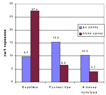 Дослідження рухово-координаційних реакцій м’язів кісті руки за результатами методики „Лабіринт” показали, що під впливом уроку евритмії об’єм роботи, тобто кількісний показник залишився на тому ж рівні, що і до уроку, однак значно збільшився якісний показник – координація рухів, що наглядно представлено на діаграмі 2.