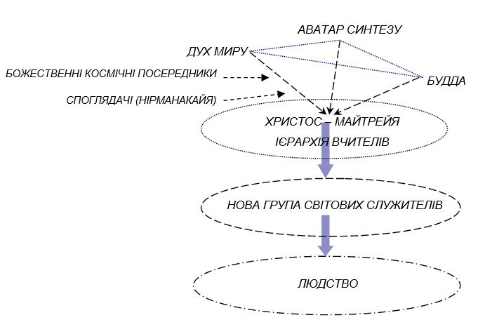 Нижча відповідність цим двом важливим групам формується між Ієрархією і Людством. Ми називаємо її Новою Групою Світових Служителів. Призначенням всіх трьох груп є ”передача енергії”. Дві вищі надзвичайно чутливі до космічних вражень і вібраційної якості поза-планетних тіл Аватарів, Які перебувають в готовності до дії як руйнівні або будівельні Енергії в будь-якій частині нашої Сонячної системи і спрямовуються Сонячним Логосом.