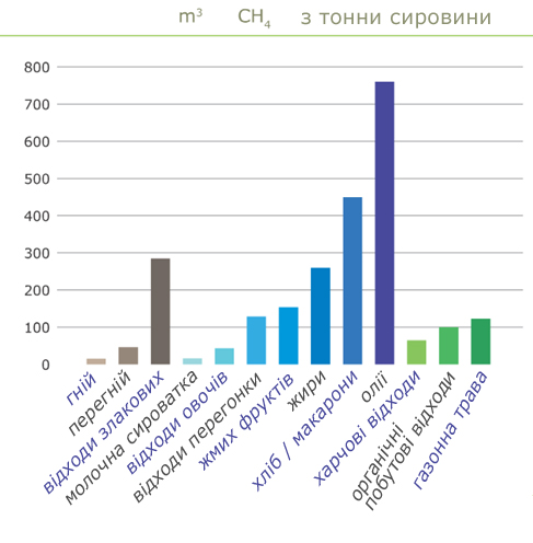 Органічна сировина, що підлягає ферментації, характеризується різним потенціалом метаноутворення (в м3 метану на тонну вихідної сировини):