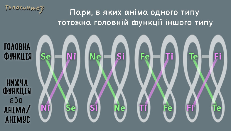Карл Юнг виділяв вісім основних психологічних типів, базуючись на їхній головній функції: Se-тип, Si-тип, Fe-тип, Fi-тип, Te-тип, Ti-тип, Ne-тип, Ni-тип. Розглянемо відносини між типами Юнга на основі соціонічної моделі.