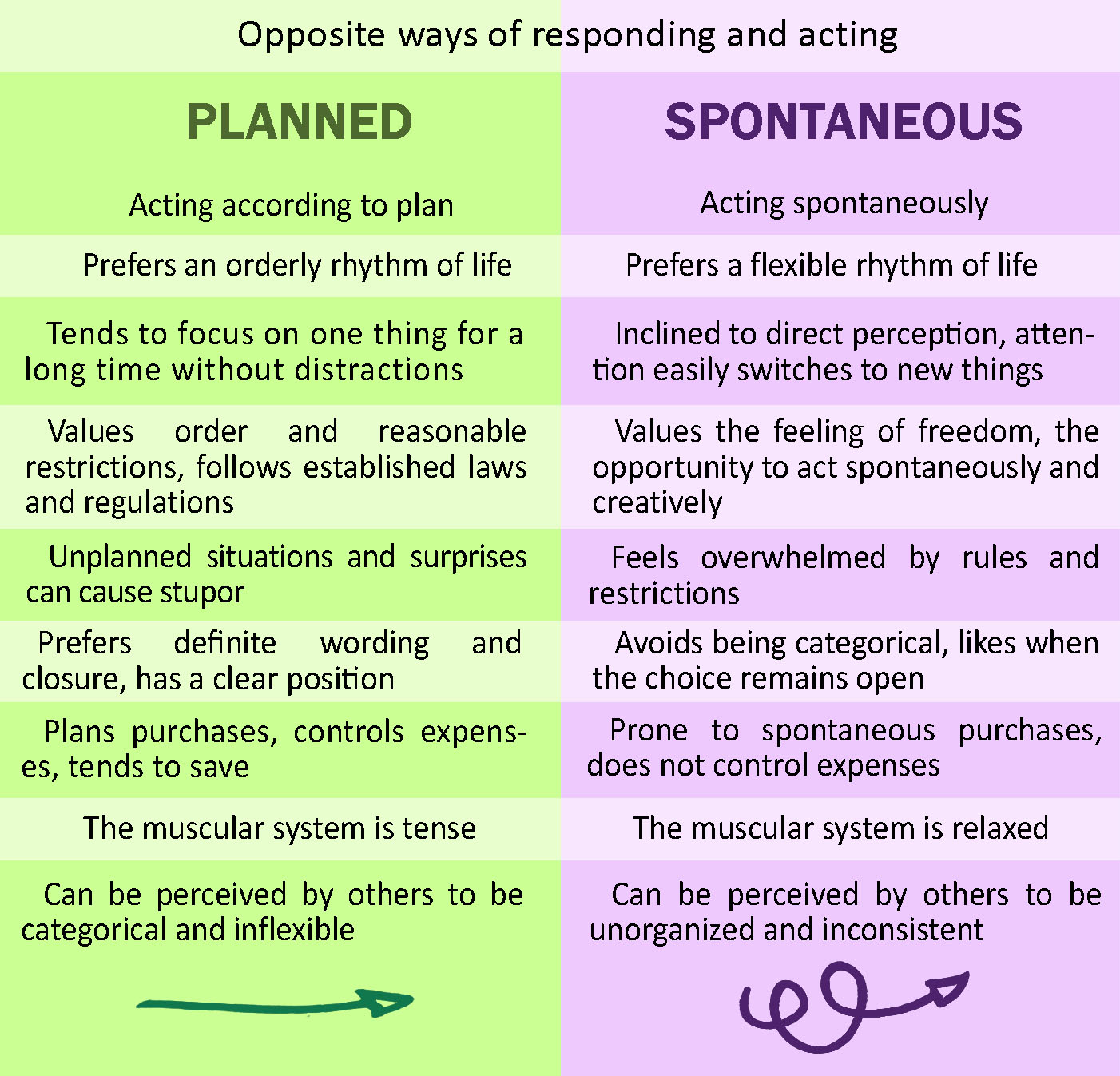 Example. Thomas and Claire decided to go to the cinema. Thomas (who has a spontaneous approach) is convinced that tickets can be purchased at the venue. And if they are not there, the plan can be changed: watch another movie or go to a cafe. Life will throw them the best option. However, Claire (who has a planned approach) is sure that tickets must be purchased in advance so that everything goes according to plan.