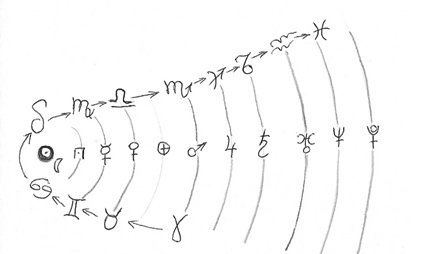 На малюнку показано принцип, за яким астрологія пов’язує знак Зодіаку і його планету-управителя: Овен-Марс, Телець-Венера, Близнюки-Меркурій, Рак-Місяць, Лев-Сонце, Діва-Меркурій, Терези-Венера, Скорпіон-Марс, Стрілець-Юпітер, Козеріг-Сатурн, Водолій-Уран, Риби-Нептун.