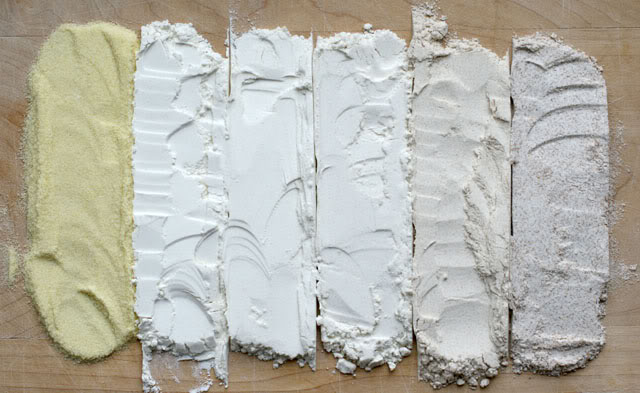 На фото: з правого боку, крайній ряд – борошно домашнього помелу. Вліво наступний ряд – воно ж, просіяне десятки разів. Наступні три – “магазинне” борошно. Останній, жовтуватий ряд – “збагачене” борошно, яке продають в магазинах під ярликом корисного, здорового продукту. Чим воно фарбоване і що його збагачує – достеменно не відомо.