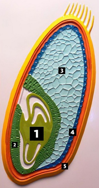 Зародок (1) – багатий на олію, а також білки, вуглеводи, вітамінами, ферменти та мінеральні речовини. В ньому багато незамінних амінокислот.