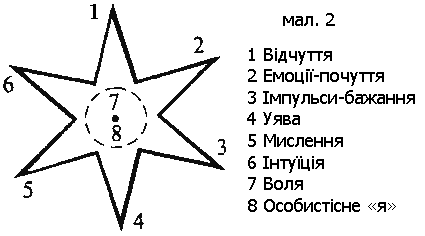 Друга карта-схема, яку Асаджіолі назвав "зіркою" (мал. 2), представляє наші психічні функції. Вона покликана прояснити інші сторони нашого внутрішнього світу, зокрема, відносини ряду психічних функцій з волею.
