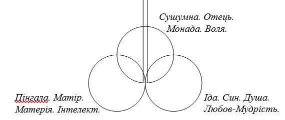 - Три великі основні проявлені складові божественності символічно знаходяться в кожному центрі: