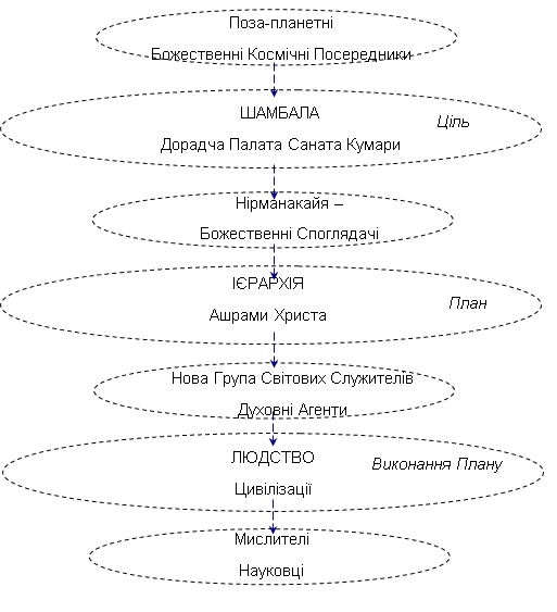 Нижча відповідність цим двом важливим групам формується між Ієрархією і Людством. Ми називаємо її Новою Групою Світових Служителів. Призначенням всіх трьох груп є ”передача енергії”. Дві вищі надзвичайно чутливі до космічних вражень і вібраційної якості поза-планетних тіл Аватарів, Які перебувають в готовності до дії як руйнівні або будівельні Енергії в будь-якій частині нашої Сонячної системи і спрямовуються Сонячним Логосом.